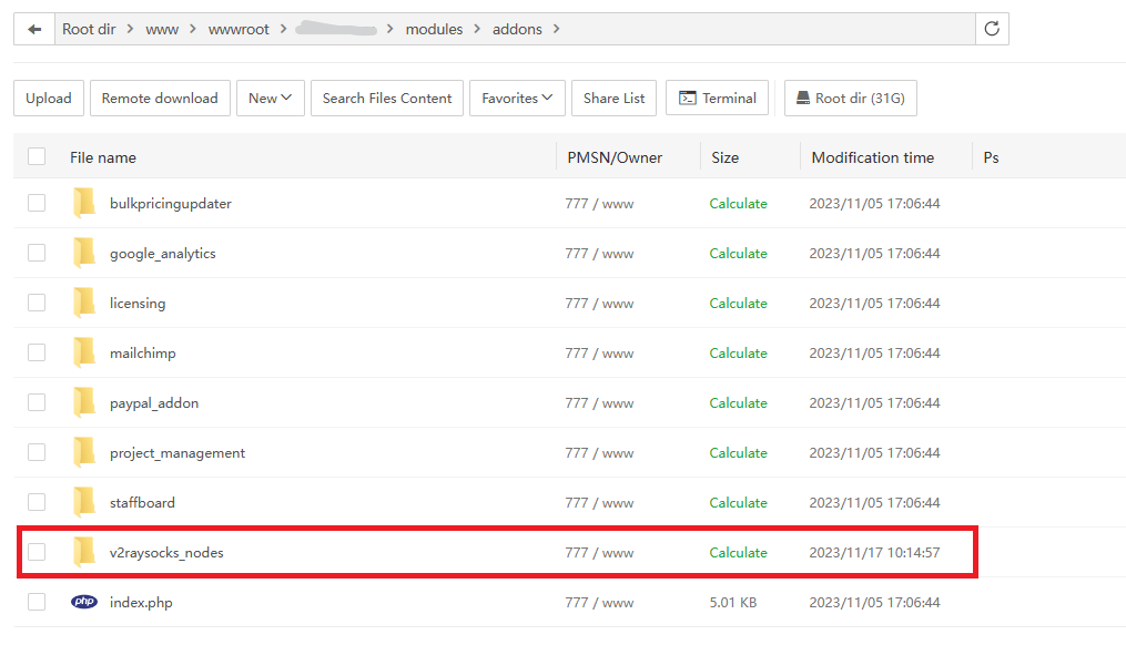 Likewise, kindly upload v2raysocks_nodes.zip to the addons directory (/modules/addons) and proceed to extract its contents.